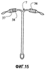 Фиг.14 и 15 иллюстрируют систему доставки в соответствии с тринадцатым и четырнадцатым воплощением данного изобретения. В тринадцатом воплощении Т-образный корпус 7 включает в себя одну капсулу 36 в одном из крыльев корпуса. В четырнадцатом воплощении Т-образный корпус 7 включает в себя дополнительно вторую и третью капсулы 37 и 38 в другом крыле корпуса.