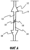 Фиг.4 иллюстрирует часть корпуса системы доставки в соответствии с третьим воплощением данного изобретения. В данном воплощении корпус 12 состоит из двух частей, первой части, включающей в себя первую стопорную часть 9, и второй части, включающей в себя вторую стопорную часть 10. Первая часть далее включает в себя, по второму концу стопорной части 9, удлинение 13 в форме стержня с крючком 15 на его конце. Вторая часть корпуса 12 далее включает в себя по второму концу стопорной части 10, удлинение 14 в форме стержня с крючком 16, идентичным, но представляющим зеркальное отображение крючка удлинения 13 на его конце. Указанные удлинения 13 и 14 сконструированы таким образом, что при помещении капсулы над одним из удлинений, другое удлинение проходит внутрь капсулы и крючки соединяются так, чтобы образовать непрерывный стержень.