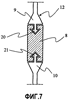 Фиг.7 иллюстрирует часть системы доставки в соответствии с шестым воплощением данного изобретения. Фиг.7 показывает корпус 12, состоящий из двух частей и капсулу 8. Вторые концы стопорных частей 9 и 10 включают в себя удлинения 20 и 21 в форме стрелы. Концы капсулы 8 включают в себя выемки, которые имеют по существу такую же форму и размер, что и стрелы удлинений 20 и 21. Капсула 8, таким образом, присоединена между стопорными частями с помощью соединений в виде защелок.