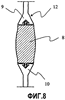 Фиг.8 иллюстрирует часть системы доставки в соответствии с седьмым воплощением данного изобретения. Данное воплощение является сходным с шестым воплощением, различие состоит в том, что выемки находятся внутри стопорных частей 9 и 10 и удлинения находятся внутри капсулы 8. В данном воплощении также показано, что диаметр поперечного сечения капсулы 8 не обязательно является постоянным по длине капсулы.