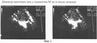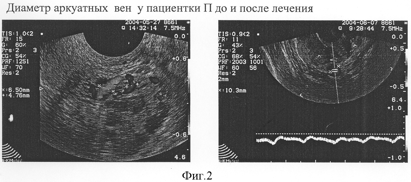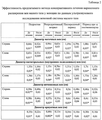По данным ультразвуковой сонографии, применение предложенного способа консервативного лечения варикозного расширения вен малого таза у женщин, восстанавливая структуру венозной стенки, стабилизирует ее тонус и позволяет приблизить к норме состояние венозной архитектоники органов малого таза. Это нашло свое отражение в статистически значимом уменьшении диаметра маточных, внутренних подвздошных, яичниковых и аркуатных вен у женщин с варикозным расширением вен малого таза, использующих предложенный метод консервативного лечения заболевания (см. таблицу 2).