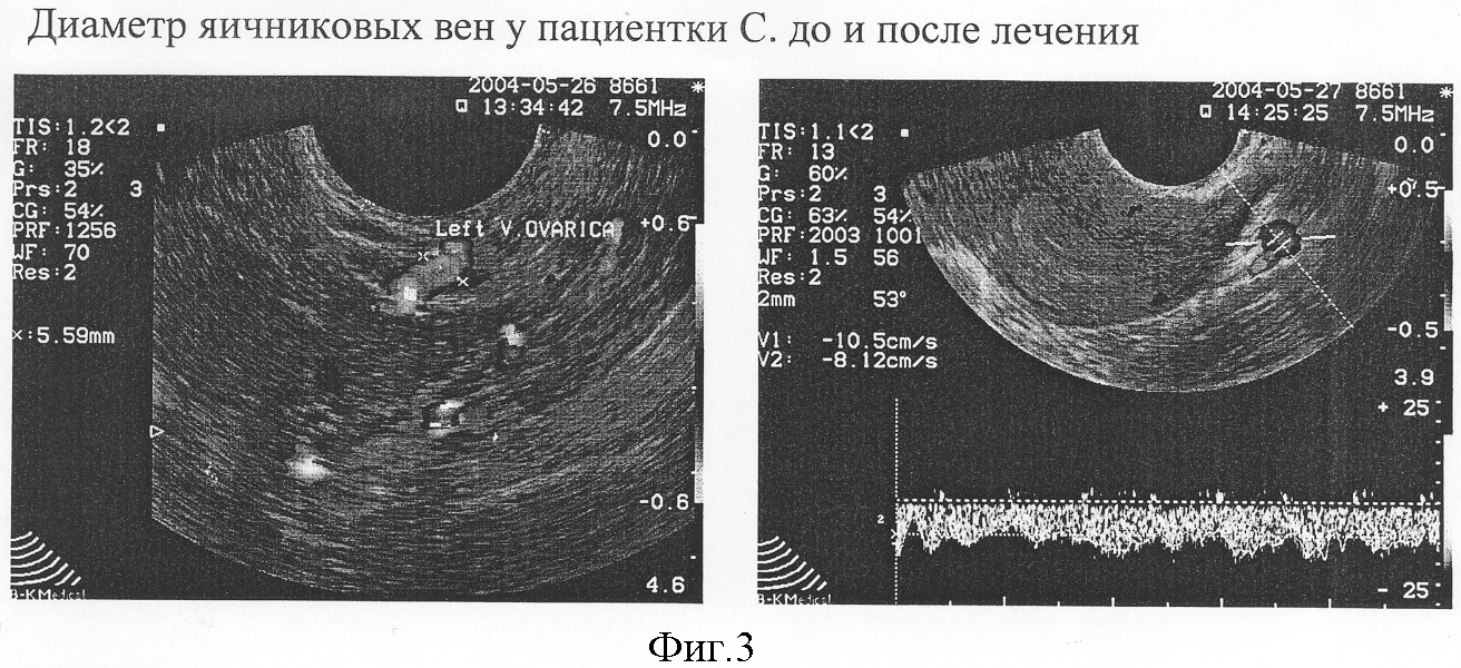 Проведено лечение предложенным способом. Спустя 2 месяца после проведенного лечения проведен осмотр пациентки. Болевой синдром в нижней части живота купировался. При вагинальном исследовании болезненность внутренних стенок малого таза купировалась. Проведено ультразвуковое исследование венозной системы малого таза, заключение: отмечается нормализация венозной архитектоники органов малого таза; диаметр маточных век составил 0,5 см справа и 0,4 см слева; диаметр внутренних подвздошных вен составил 1,3 см и 1,2 см соответственно, диаметр яичниковых вен 0,2 см и 0,2 см соответственно; диаметр аркуатных вен 0,1 см. При допплерографическом исследовании выявлено повышение пиковой систолической скорости кровотока в маточных венах: 3,6 см/с справа и 2,2 см/с слева (фигура 3).