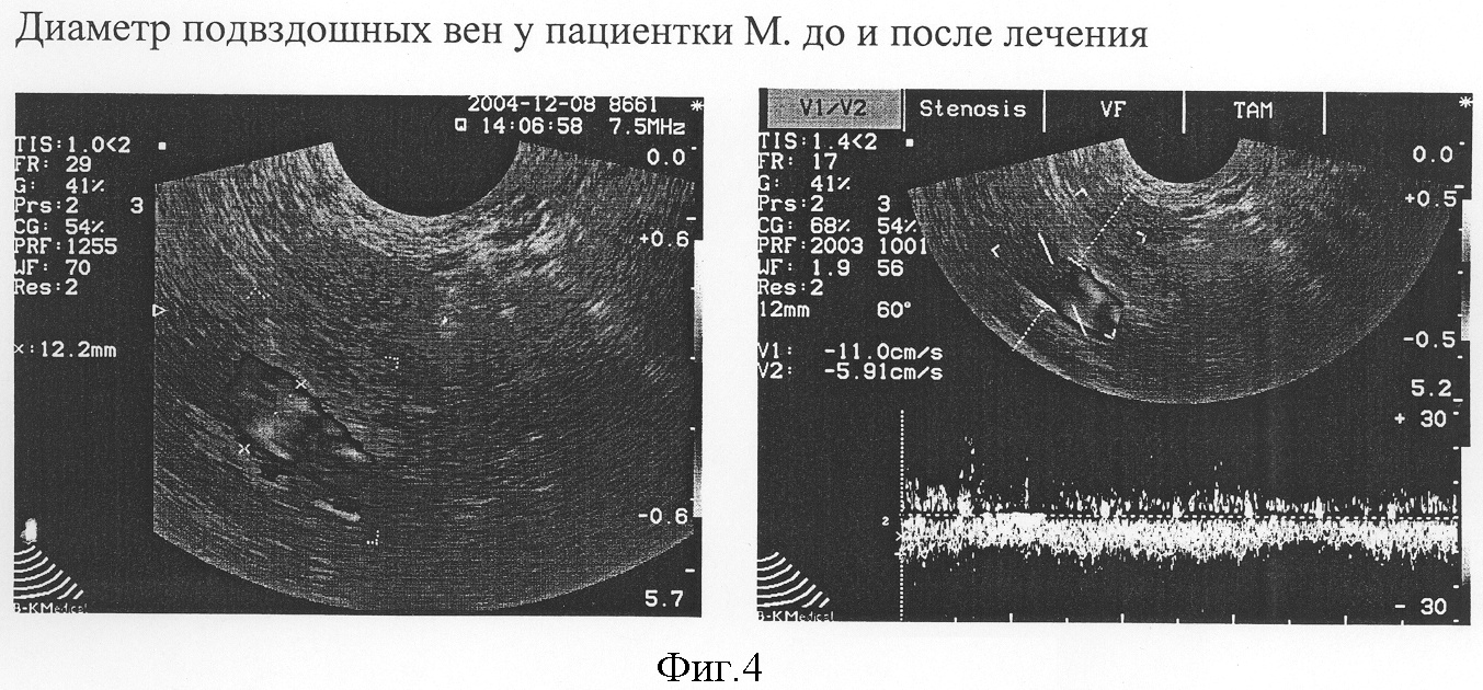 Проведено лечение предложенным способом. Спустя 4 месяца после проведенного лечения проведено ультразвуковое и допплерографическое исследование венозной системы малого таза пациентки. Заключение ультразвукового исследования: отмечается нормализация венозной архитектоники органов малого таза; диаметр маточных вен составил 0,6 см справа и 0,5 см слева; диаметр внутренних подвздошных вен составил 1,1 см и 1,2 см соответственно, диаметр яичниковых вен 0,2 см и 0,3 см соответственно; диаметр аркуатных вен 0,2 см. При допплерографическом исследовании выявлено повышение пиковой систолической скорости кровотока в маточных венах: 4,1 см/с справа и 3,9 см/с слева (фигура 4).