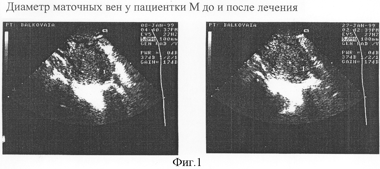 С 1 суток послеоперационного периода начато лечение предложенным способом. Спустя 2 месяца после проведенного лечения проведен осмотр пациентки. Болевой синдром в нижней части живота купировался. Проведено ультразвуковое исследование венозной системы малого таза, заключение: отмечается нормализация венозной архитектоники органов малого таза; диаметр маточных вен составил 0,9 см справа и 1,0 см слева; диаметр внутренних подвздошных вен составил 1,1 см и 1,2 см соответственно, диаметр яичниковых вен 0,2 см и 0,4 см соответственно; диаметр аркуатных вен 0,1 см (фигура 1).