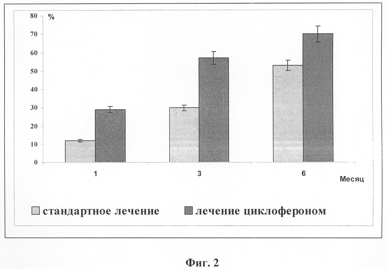Предлагаемый способ лечения Циклофероном использовался в пенитенциарном учреждении при комплексном лечении туберкулеза легких. В исследование было взято 75 человек, из них 31 человек получали стандартную полихимиотерапию, а 44 больным дополнительно назначался иммунокорректор Циклоферон по следующей схеме 0,6 г рег os в 1, 2,4, 6, 8, 11, 14, 17, 20, 23 дни и далее 3 раза в неделю по 0,3 г рег os на протяжении 2-х месяцев.