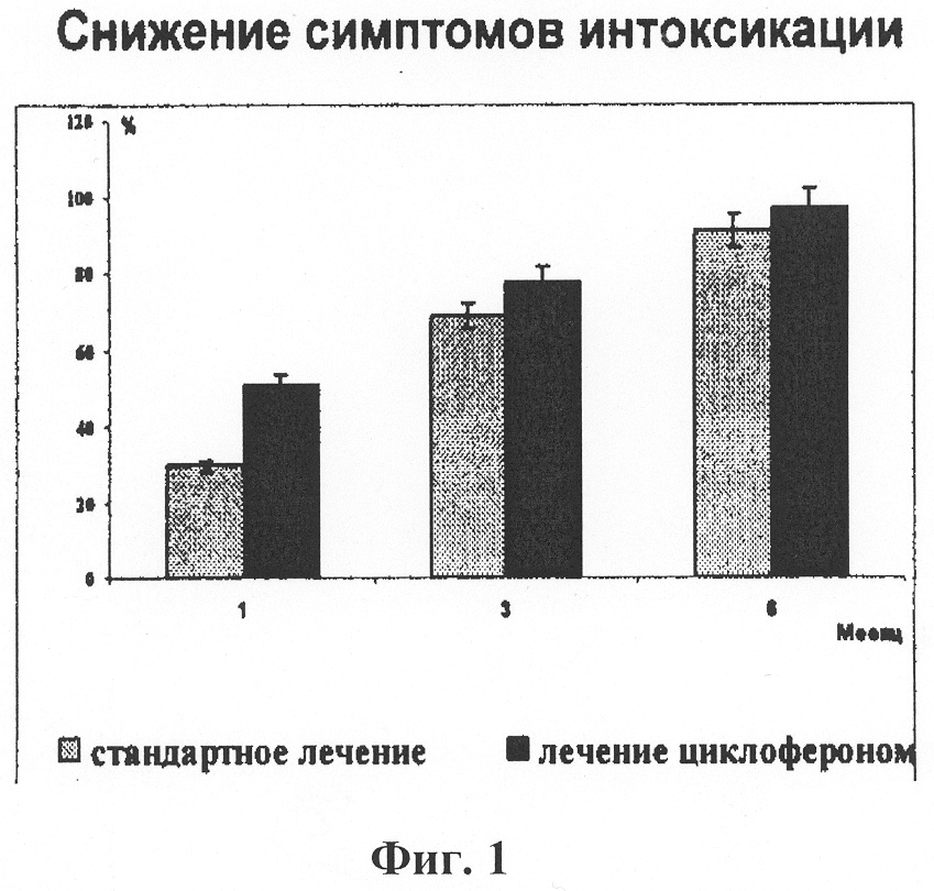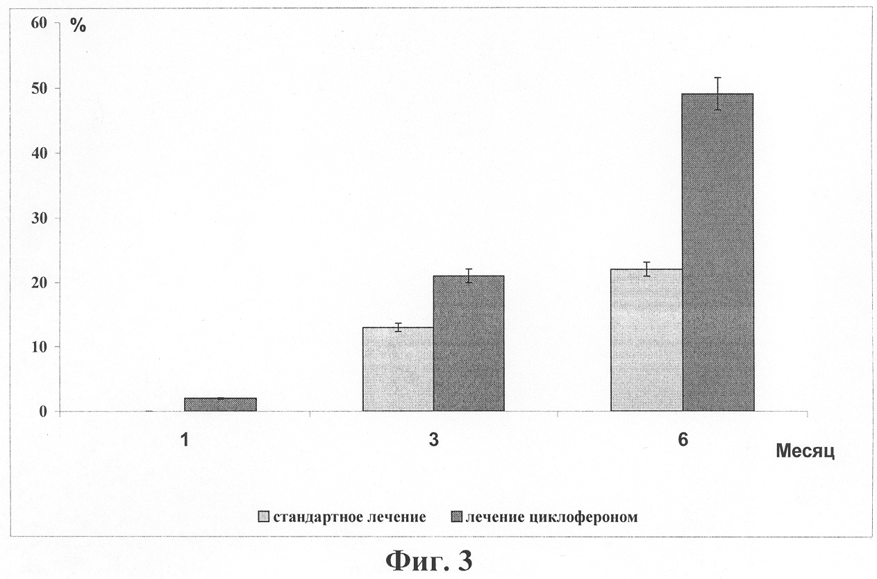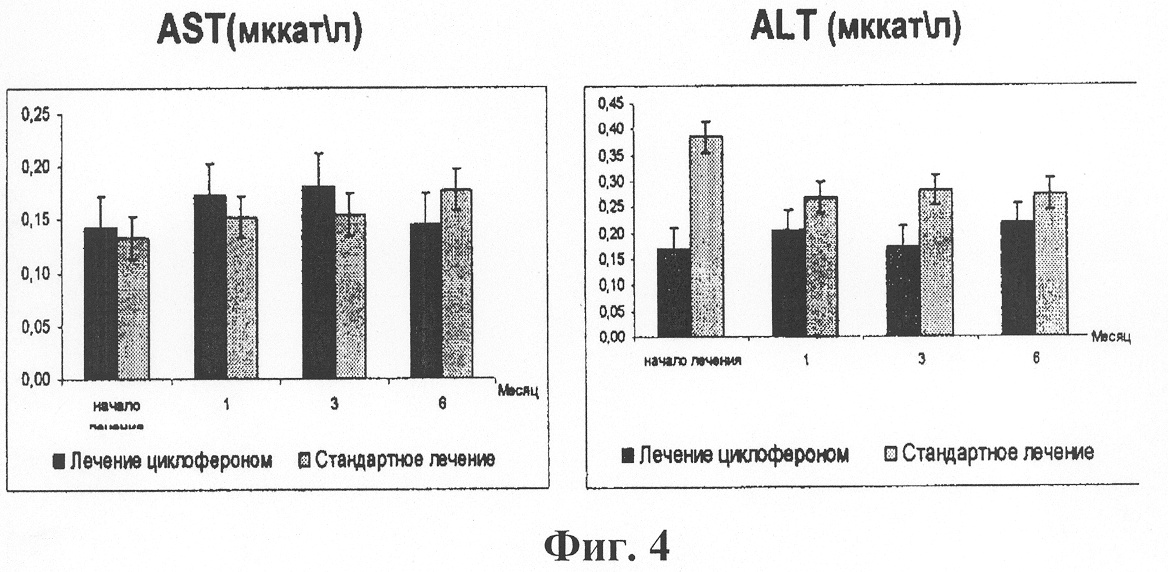 – гепатопротекторный эффект: снижение поражений печени в процессе лечения циклофероном в составе комплексной терапии на 30-40% по сравнению со стандартной полихимиотерапией (фиг.1-4);
