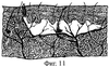 на Фиг.10 – схематичное изображение начального этапа реализации технологии поверхностной липосакции (дезинтеграция и эмульгирование липоцитов в субдермальном поверхностном слое гидропрепарированной жировой ткани области липосакции);