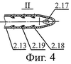 на Фиг.4 – сечение рабочего окончания пневмогидравлической диспергирующей канюли с тангенциально расположенным сопловым отверстием для осуществления гидроимпульсной поверхностной (субдермальной) дезинтеграции и эмульгирования липоцитов предварительно гидропрепарированной жировой ткани (зона I на Фиг.2);