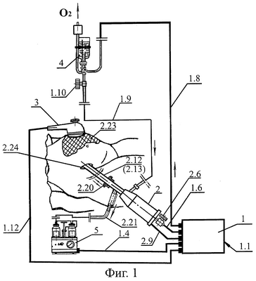 После этого заправляют емкость 3.7 акустического узла (АКУ) 3 раствором озон/NO-содержащего вещества и озонид/NO-содержащего 5-10% водного раствора масляной эмульсии типа “масло в воде”. На поверхность кожи, в области намеченной липосакции, укладывают промежуточную капиллярно-пористую (2-4 слойная марлевая салфетка) прокладку (далее – прокладка) 2.22, предварительно пропитанную вышеприведенным раствором озон/NO-содержащего вещества. Акустический узел (АКУ) 3 прикладывают излучающим торцом 3.1 к прокладке 2.22. Включают ультразвуковой генератор (УЗГ) 1.11, соединенный с акустическим узлом (АКУ) 3, и осуществляют контактное озвучивание всей поверхности кожи над областью липосакции низкочастотным ультразвуком путем кругового или линейного перемещения акустического узла (АКУ) 3 по поверхности прокладки 2.22. При этом через сквозное капиллярное отверстие 3.2, сообщающееся с емкостью 3.7 и излучающим торцом 3.1, прокладка 2.22 и далее – поверхность кожи над областью липосакции, дополнительно, в процессе озвучивания, насыщаются раствором озон/NO-содержащего вещества. По окончании этапа поверхностной контактной ультразвуковой обработки (виброультразвуковой массаж) области липосакции ультразвуковой генератор (УЗГ) 1.11 выключают, а акустический узел (АКУ) 3 и отработанную прокладку 2.22 убирают. После этого выполняют намеченные ранее кожные разрезы, через которые в дальнейшем удаляют избыточный жир. Далее включают в работу пневмокомпрессор (ПК) 1.5, управляющий ключ (К-ЭК) 2.10 электроклапана (ЭК) 2.8, расположенного в пневмогидравлическом узле (ПГУ) 2, электроотсасыватель 5 и аппарат “ОЗОТРОН” 1.7. Регулятором расхода 2.6 пневмогидравлического узла (ПГУ) 2 устанавливают необходимый уровень расхода потока сжатого газового компонента (воздух или озон/NO-содержащая газовая смесь), подаваемого в камеру-рессивер 2.3, сопряженную с электроклапаном (ЭК) 2.8, сообщающимся посредством пневмопровода 1.6 с пневмокомпрессором (ПК) 1.5.