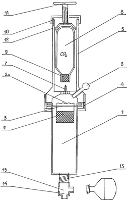 Работа устройства. В шприц 1 набирают 50 мл раствора, например 0,25% новокаина, добавляют в раствор нетоксичный краситель, например метиленовую синьку, отрезают толкатель поршня 2 на уровне проксимального отдела шприца, на шприц 1 надевают прокладку 3, шприц 1 с жидкостью устанавливают в цилиндр 4 и соединяют герметично на резьбе с держателем баллона 5, в котором устанавливают манометр 6 и иглу с каналом 7, в держатель баллона 5 вставляют баллон 8 со сжатым газом СО2 и завинчивают крышкой 10, штуцер шприца 13 соединяют с гнездом 14 трехходового крана 15 и закрывают кран гнезда 14. Вращают ручку 11 и толкателем 12 насаживают баллон 8 на иглу с каналом 7, игла прокалывает свинцовую пробку 9 и газ СО2 под давлением поступает в замкнутую полость и давит на поршень, это давление регистрируют манометром 6. Если открыть кран гнезда 14, окрашенная жидкость под давлением начнет поступать в канал соответствующего подключенного специального инструмента.