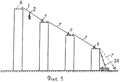 Устройство используется следующим образом. Если наружные устройства спасательного комплекса в исправности, то при возникновении пожара в высотных зданиях, который перекрывает часть срединных этажей, у людей остается, помимо спасательного вертолета, возможность спастись по канату. При этом люди должны выбегать на крышу, желательно со своей спасательной амуницией, которая, подобно пассажиру парахода, желательно, чтобы была у каждого из жителей верхних этажей высотного здания, и по очереди цеплять свои карабины на трос. Спускающегося встречает мягкая тормозящая подушка ловителя, масса которой по возможности должна быть малой, и дальнейшее торможение происходит за счет деформации пружины 13 и того воздуха, который сдавливается перед поршнем 11. После конечной остановки подушки ловителя /показано пунктиром/ подушка несколько откатывается назад и спасающийся в зависимости от своего веса и роста оказывается на приставном столе 22; на своих ногах, на коленях или висящим на карабине и ему с помощью добровольцев или дежурящего на столе пожарного должна быть оказана быстрая помощь и спустившийся по лесенке 26 или по скатной доске 27 должен быстро освободить место для следующего, которого уже поджидает вставшая в первоначальное исходное положение подушка ловителя. Если пожар случится в зданиях, например, 6 и последующим за ним одновременно, то спускающемуся со здания 6 придется спускаться “с пересадкой”.