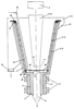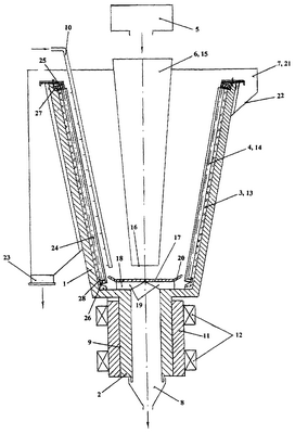 В межреберных впадинах концентрационного элемента 3 размещены щеточные ролики 24, концы которых закреплены в конических кольцах 25 и 26 с возможностью свободного вращения вокруг своей оси. Верхнее кольцо 25 подвижно закреплено в кольцевом пазу 27 верхней кромки конической чаши 1. Нижнее кольцо 26 с радиальным зазором 28 свободно соприкасается с поверхностью концентрационного элемента 3.