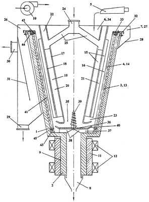 В межреберных впадинах концентрационного элемента 3 размещены щеточные ролики 41, концы которых закреплены в конических кольцах 42 и 43 с возможностью свободного вращения вокруг своей оси. Верхнее кольцо 42 подвижно закреплено в кольцевом пазу 44 верхней кромки конической чаши 1. Нижнее кольцо 43 с радиальным зазором 45 свободно соприкасается с поверхностью концентрационного элемента 3.