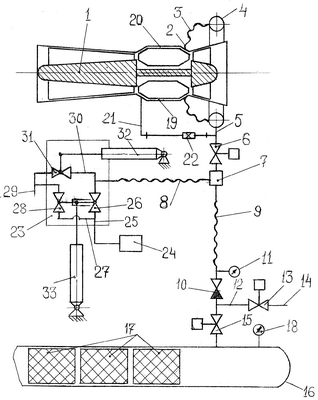 После прекращения подачи воды в устройство впрыска воды в воздух 7 и осушения его и рукава 8, электромеханическим приводом 32 закрывают кран 31 второго отвода 30 и останавливают авиационный газотурбинный двигатель 1.