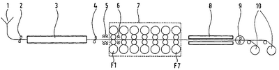 После печи 3 с роликовым подом следует устройство 5 для гидросбива окалины, за которым следует семиклетевой прокатный стан 7 с параметрами прокатки, обозначенными как F1 – F7. На выходе прокатного стана 7 предусмотрен участок 8 охлаждения, к которому в направлении подачи полосы примыкают летучие ножницы 9, которые применяются в случае использования полубесконечной или, соответственно, бесконечной прокатки. Установка горячей прокатки заканчивается двумя моталками 10, которые альтернативно могут быть выполнены в виде роторного наматывающего устройства. Между клетью F1 и клетью F7 расположено межклетевое устройство 6 удаления окалины.