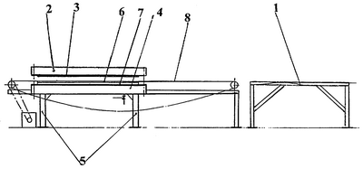 Устройство для ламинирования плит работает следующим образом. Предназначенную для облицовки плиту укладывают на стол 1, наносят на поверхность плиты клеевой состав и на него материал для облицовки (бумагу, пленку, пластик или шпон). Затем плиту переносят на ленточный транспортер 8 и подают в загрузочный просвет между листом алюминия 3 верхней нагреваемой плиты 2 и мембраной 6 пневматической камеры 7 нижней плиты 4, при этом перемещением верхней плиты 2 устанавливают загрузочный просвет на 10 мм больше, чем толщина заготовки. Далее открывают кран пневмосистемы и воздух от компрессора подают в пневмокамеру 7, при этом заготовка поджимается к нагретому до необходимой температуры (100-180°C) алюминиевому листу 3 верхней плиты 2. Необходимую температуру поддерживают с помощью датчика-регулятора, а необходимое удельное давление – настройкой электроконтактного манометра. Давление выдерживают в течение заданного времени, затем сбрасывают, и готовое изделие с облицованной поверхностью перемещают транспортером 8, удаляя из пресса.