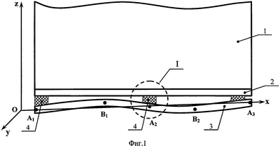 Предварительно определяют собственные частоты акустических колебаний газовой среды кузова 1, что может быть сделано расчетными методами, например, посредством программы ANSYS, либо экспериментальным путем с помощью синусоидального акустического сигнала, излучаемого громкоговорителем со сканированием по частоте и измерением шума в трех-четырех точках кузова. В результате этого получают набор собственных частот, на которых реализуются акустические колебания газовой среды кузова 1 резонансного типа. После этого устанавливают кузов 1 на раму 3 ТС без применения упругих элементов 4 и фиксируют его положение на раме с помощью элементов крепления 5, 6 и 7. Затем проводят дорожные испытания ТС с измерением шума внутри кузова согласно нормативным документам, например, ГОСТ Р 51616-2000 «Автомобильные транспортные средства. Шум внутренний. Допустимые уровни и методы испытаний», М.: изд-во Стандартов, 2002 г., и получают частотный спектр измеренного шума. После этого идентифицируют полученные при дорожных испытаниях кузова 1 частоты спектра шума с собственными частотами акустических колебаний газовой среды кузова 1 и определяют частоту, на которой при дорожных испытаниях реализуется максимальный уровень звукового давления в кузове 1 (эта частота, как правило, является одной из собственных частот колебаний газовой среды салона, для реализации которой создались благоприятные условия). Определив эту частоту (обозначим ее, например, f0), далее определяют зоны расположения узлов (минимумов) вертикальной колебательной скорости рамы 3 ТС (вдоль оси Z на фиг.1) при ее изгибных колебаниях на частоте, которая близка к частоте (либо равна ей) максимального уровня звукового давления в кузове 1, т.е. на частоте f0. На практике достаточно исследовать частотный диапазон изгибных колебаний рамы f0-0,1f0 f f0+0,1f0. Для этого раму 3 возбуждают тональной вибрацией с частотой f0 и с помощью акселерометров определяют зоны узлов вертикальной колебательной скорости рамы при ее изгибных колебаниях (в плоскости XOZ). На фиг.1 узловые зоны обозначены как A1, А2 и А3 (зоны пучностей (максимумов) колебательной скорости рамы в плоскости X0Z на фиг.1 обозначены как B1 и В2). После этого в зонах расположения узлов вертикальной колебательной скорости рамы устанавливают упругие элементы 4, например, резиновые прокладки и фиксируют положение кузова 1 на раме 3 с помощью элементов крепления, состоящего, например, из стремянок 5, опорных пластин 6 и гаек 7. Таким образом, установка упругих элементов 4 в зонах узлов вертикальной колебательной скорости рамы 3 при ее изгибных колебаниях на частоте, близкой к частоте, на которой реализуется максимальное звуковое давление в кузове 1 при дорожных испытаниях ТС, позволяет свести к минимуму передачу возбуждений с рамы к основанию кузова, что, в свою очередь, приводит к существенному снижению уровня шума внутри кузова и исключает возникновение акустических резонансных явлений в кузове. Следует отметить, что указанную в заявляемом способе последовательность действий осуществляют не для каждого ТС, сходящего с конвейера, а только для характерного представителя типа ТС. Заявляемый автором способ опробован на автобусе специальном Урал-3255 и его модификациях, которые предназначены для перевозки людей в условиях бездорожья (лесозаготовки, тундра, гористая м