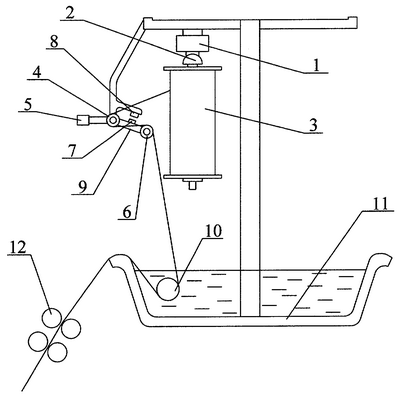 Рычаг 9 под воздействием расположенного на нем груза 5 отклюняется и занимает свое исходное положение. Ровница, сматываясь с катушки, огибает направляющий ролик 4 и отклоняющий ролик 6, закрепленный на рычаге, поступает в корыто 11. Из корыта через питающий вал 10 ровница поступает в питающую пару вытяжного прибора 12. При вращении валиков питающей пары создается натяжение ровницы, за счет которого рычаг 9 с отклоняющим роликом 6 поворачивается вокруг своего исходного положения по часовой стрелке. При этом датчик Холла 7, закрепленный на рычаге 9, удаляется от магнита 8, закрепленного на кронштейне. После удаления его на определенное расстояние датчик Холла срабатывает, и по сигналу от него включается шаговый двигатель 1, вращающий катушку с ровницей 3. Натяжение ровницы уменьшается, и рычаг 9 с отклоняющим роликом 6 возвращается в свое исходное положение, шаговый двигатель 1 по сигналу датчика Холла 7 выключается. В результате натяжение ровницы за весь цикл работы устройства остается низким, так как оно не достигает величин, при которых должно обеспечиваться вращение катушки, имеющей значительную массу.