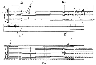 На фиг.1 представлен чертеж останавливающего ограждения, где: 1 – неподвижный блок в виде стальной плиты с отверстиями, в которые вмонтированы цилиндрические контейнеры, 2 – подвижный блок, 3 – станина с горизонтальными направляющими, 4 – установочные отверстия, 5 – телескопическая поршневая группа, 6 – контейнеры с демпфирующим “рабочим телом”.