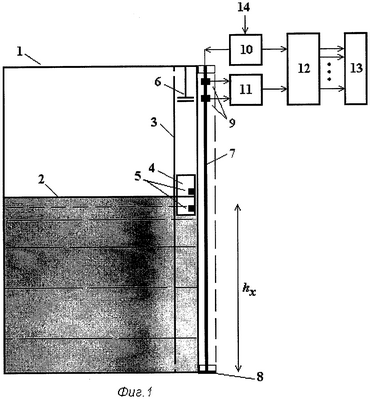 На боковой поверхности резервуара 1 с рабочей средой 2 с внешней стороны закреплен прямолинейный звукопровод 7 с отражающей нагрузкой 8 в нижней части. В верхней его части на опорном расстоянии друг от друга закреплены два ЭАП, подключенные к сигнальному входу БКВ 12 через усилитель 11 считывания. Другой сигнальный вход БКВ через генератор 10 записи подключен к звукопроводу, а выходы соединены с информационными входами БИ 13. Генератор 10 записи подключен к шине 14 управления. С внутренней стороны резервуара 1 соосно со звукопроводом 7 размещен поплавковый элемент 4 с парой постоянных магнитов 5, установленных на одинаковом опорном расстоянии, как и ЭАП 9. Поплавковый элемент 4 фиксирует раздел (уровень) рабочей среды и помещается в рабочем пространстве резервуара 1, образованном его направляющей плоскостью 3. Диапазон этого перемещения устанавливает ограничитель 6 перемещений.