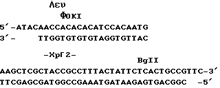 Очень грубая рестрикционная карта вставки ДНК Y.lipolytica из 3,6 тыс.п. в BamHI сайт pBP322 /включая pLD56/ описана ниже с указанием в скобках примерного расстояния в парах оснований от начала вставки. Оценка расстояний сделана из немногих анализов на агарозных гелях и, возможно, содержит относительно большие количественные погрешности: PvuН/800/, PvuII/1200/, PstI/1800/, MIuI/2000/, PstI/2300/, EcoRU/2700/, NcoI/3200/ для ориентации: SaII сайт pBP322 будет предшествовать описанным сайтам и сайт HindIII будет следовать за ними.