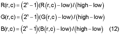 На шаге 303 выполняют линейное растяжение значений RGB изображения на весь допустимый диапазон: