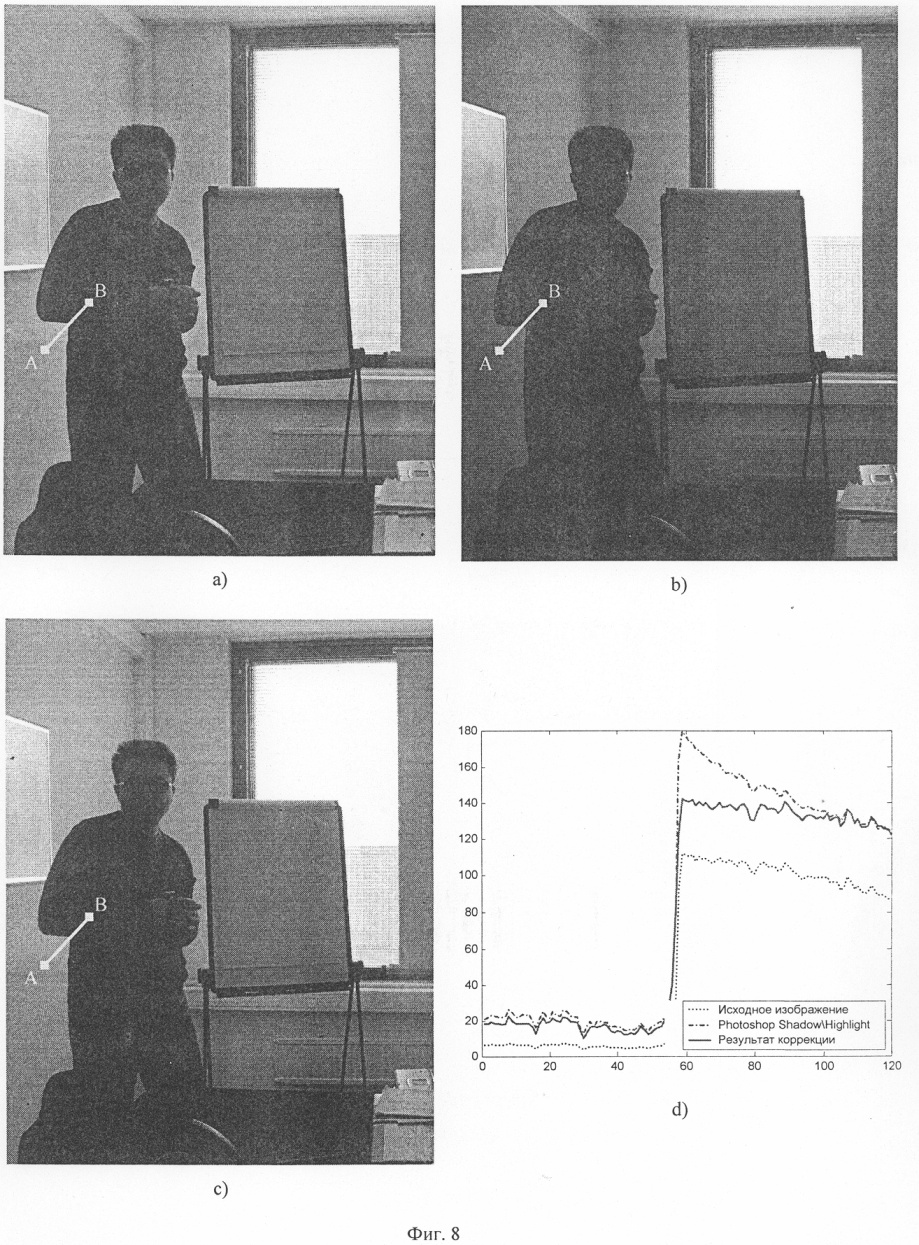 Фиг.8 демонстрирует одно из преимуществ предлагаемого способа улучшения темных оттенков перед способом, используемым в Adobe Photoshop CS (пункт меню Shadow/Highlight): 8(a) – результат работы Photoshop CS Shadow/Highlight, 8(b) – первоначальная необработанная фотография, 8(с) – улучшенная предлагаемым способом фотография, 8(d) – графики изменения яркости вдоль отрезка прямой АВ. Применение Adobe Photoshop CS Shadow/Highlight приводит к возникновению хорошо заметного ореола вдоль контрастных границ, при применении предложенного способа коррекции изображений ореол отсутствует.