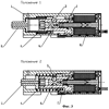 В исходном положении 1 шток фиксатора (3) выдвинут и заперт шариками (5), упирающимися в цилиндрическую часть штока якоря (6). После срабатывания шток фиксатора переходит в положение 2. Шток фиксатора (3), рабочая пружина (4), шарики фиксатора (5) объединены в силовую, а шток якоря (6), пружина якоря (7) и катушка электромагнита (8) в управляющую ступени.
