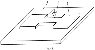 На фиг.1 представлена структура, полученная при помощи фотолитографии, где 1 – монокристаллическая подложка MgO, 2 – ВТСП пленка состава Bi(Pb)2Sr2Ca2Cu3O10, 3 – зонд атомно-силового микроскопа.