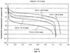 Такая конструкция гальванического элемента не является предметом предлагаемого изобретения, так как в ней не используются обеспечивающие преимущества электропроводные слоистые структуры 5 и 6, описанные выше. Однако тестирование гальванического элемента такой конструкции в условиях, описанных в Примере 1, оказалось полезным для демонстрации преимуществ, представляемых конструкцией гальванического элемента по предлагаемому изобретению. В частности, тестирование показало, что текущая мощность гальванического элемента без внешних участков полимерной пленки была сравнима по величине с этим параметром у гальванического элемента по предлагаемому изобретению, описанного в Примере 1, который содержит внешние участки полимерной пленки, снабженные сквозными отверстиями, через которые обеспечивается доступ к участкам металлической фольги с обеспечением, тем самым, условий для протекания электрического тока через гальванический элемент. На фиг.6 графически показано изменение напряжения полученного гальванического элемента при различных значениях разрядного тока. Сравнение с графиками, приведенными на фиг.5 (см. Пример 1), показывает, что вольтовые характеристики сравниваемых гальванических элементов сходны.