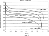 После этого осуществлялось вакуумное наполнение гальванического элемента по технологии, заключающейся в вакуумном отсосе из гальванического элемента воздуха и последующем самотечном заполнении его электролитом. В рассматриваемом примере для заполнения гальванического элемента был использован электролит, содержащий 30% гидроокиси калия (КОН) и 1% гидроокиси лития (LiOH). После заполнения электролитом гальванический элемент был оставлен на 24 часа для пропитывания, после чего он был подвергнут трем циклам активации. Каждый цикл активации заключался в зарядке продолжительностью 81/2 часа током 200 мА и разряде током 500 мА до напряжения 0,8 В, или же в течение времени максимум 31/2 часа. После этого гальванический элемент подвергался испытаниям с разными токами разряда, как показано на фиг.5. Между разрядами гальванический элемент подвергался стандартной зарядке продолжительностью 81/2 часа.