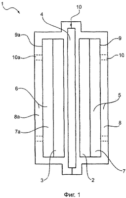 Среднему специалисту соответствующего профиля должно быть понятно, что галетный гальванический элемент 1 может быть изготовлен в сухом состоянии и снабжен отверстием для заполнения, выполненным в первой электропроводной слоистой структуре 5 или второй электропроводной слоистой структуре 6, через которое может быть осуществлено вакуумное заполнение галетного гальванического элемента 1 или его заполнение под давлением, после чего отверстие для заполнения может быть заделано с помощью подходящих средств. При такой технологии воздух из гальванического элемента может быть удален, если он там имеется, через это отверстие для заполнения путем вакуумного отсоса, а под действием разности давлений электролит заполнит поры электродов и сепаратора. В альтернативном варианте осуществления предлагаемого изобретения перед осуществлением герметизации галетного гальванического элемента 1 по периметру, как это было описано выше, отрицательный электрод 2, положительный электрод 3 и сепаратор 4 могут быть подвергнуты предварительному увлажнению или предварительному смачиванию с помощью взятого в надлежащем количестве электролита. Объем электролита, который может быть введен в гальванический элемент, может составлять, например, от 60% до 90% от объема пор электродов и сепараторов.