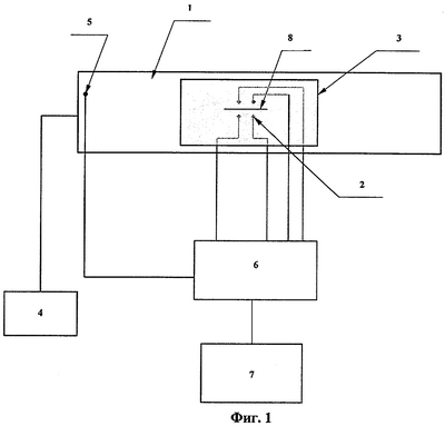 На фиг.1 и 2 обозначены испытуемая труба 1 с установленными на ней термопарами 2, холодильная камера 3, гидропресс 4, датчик 5 давления, блок 6 сбора данных, персональный компьютер 7 и концентратор 8 напряжений в виде осевого надреза заданной длины.
