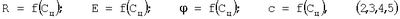 с=f(Cц), где Сц – отношение количества цемента к массе воздушно-сухого грунта, %, v0,1N HCl – объем 0,1N раствора HCl, израсходованный на нейтрализацию остаточной свободной щелочи цемента, мл; Т – возраст твердения, сутки; R – предел прочности цементогрунта на одноосное сжатие, МПа; Е – модуль упругости цементогрунта, МПа;