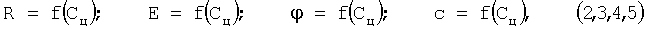 =f(Сц); с=f(Сц), где Сц – отношение количества цемента к массе воздушно-сухого грунта, %, V0,1N HCl – объем 0,1N раствора HCl, израсходованный на нейтрализацию остаточной свободной щелочи цемента, мл; Т – возраст твердения, сутки; R – предел прочности цементогрунта на одноосное сжатие, МПа; Е – модуль упругости цементогрунта, МПа;