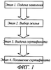 Когда весь процесс разбит на этапы, составляется блок-схема, изображающая какой этап выполняется вначале, какой после этого, какой завершает процесс и т.д. Таким образом, все этапы, участвующие в данной схеме, соединяются переходами (условно (-) стрелками), показывающими предполагаемый порядок прохождения этапов в данной сертификатной схеме. Удобно изображать такую блок-схему, например, образом, показанным на фиг.1.