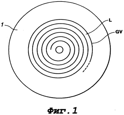 Как показано на фиг.1, в оптическом диске, согласно варианту осуществления настоящего изобретения, сформирована бороздка GV, действующая как дорожка записи. Эта бороздка GV сформирована по спирали, проходящей от внутреннего края до внешнего края диска. Таким образом, как показано на фиг.2, при рассмотрении в радиальном поперечном сечении оптический диск имеет площадку L выпуклой формы и углубленную бороздку GV, расположенные поочередно друг за другом.