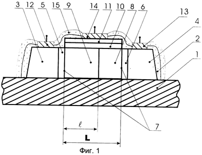 Отличием при формировании маски 20 длиной L=1,5 мкм в процессе создания затвора 11 является равная L – l величина перекрытия маски 20 от границы 16 в часть островка 2, легированную примесью n-типа проводимости (фосфором), что для p-канального транзистора может составлять не менее 1/3L, то есть при L=1,5 мкм – не менее 0,5 мкм.
