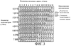 На фиг.3 схематически представлена общая матрица кодирования для сигнализации о распределении мультикодов согласно приведенному в качестве примера варианту осуществления настоящего изобретения. В этой матрице показана пара чисел, одно наверху, представляющее количество мультикодов, и одно внизу, представляющее смещение слева направо в кодовом дереве. Соответствующие индикаторы кодов представлены с левой стороны матрицы по вертикали, а соответствующие индикаторы смещений показаны над матрицей по горизонтали.