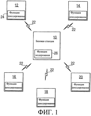 Всякий раз, когда базовой станции 10 необходимо установить связь с сетевым устройством 12-20, эта базовая станция 10 определяет, сколько мультикодов должно быть распределено для осуществления связи. Затем базовая станция 10 может послать сетевому устройству информацию, уведомляющую это сетевое устройство о том, сколько мультикодов будет использовано для связи, а также о том, с какого кодового смещения в кодовом дереве начинаются мультикоды. Базовая станция 10 может принять решение о том, сколько мультикодов можно распределить конкретному сетевому устройству или пользователю, в зависимости от различных факторов, например: объема информации, подлежащей пересылке от базовой станции пользователю; состава других операций, выполняемых в данный момент на базовой станции; мощности, имеющейся на базовой станции и/или сетевом устройстве; информации о свободных или используемых кодах в кодовом дереве и т.п. Базовая станция 10 может закодировать информацию о количестве мультикодов и кодовом смещении, используя функцию 24 кодирования. Каждое сетевое устройство 12-20 может включать функцию 26 декодирования для декодирования кодового слова, поступающего от базовой станции 10, и выделения информации о количестве мультикодов и кодовом смещении. Как базовая станция 10, так и сетевые устройства 12-20 могут содержать функции кодирования и/или функции декодирования. Функции кодирования и/или функции декодирования могут быть реализованы аппаратными средствами, программными средствами, с помощью микрокода (микрокоманд) либо с использованием комбинации перечисленных средств.