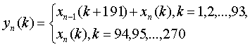 Выходные сигналы процедуры представляют собой 270 выборочных импульсов, которые при конкатенации образуют серию импульсов с предварительно скомпенсированным перекрытием. Каждый из этих выходных импульсов процедуры обработки начинается с перекрывающейся части из 79 выборок двух последовательных, предварительно скомпенсированных импульсов. Остальные 191 выборки выходного сигнала представляют собой неперекрывающуюся часть второго из двух предварительно скомпенсированных импульсов. Точнее, если xn(k), k=1,2,…,349 означает n-й импульс с предварительно скомпенсированным перекрытием, то соответствующий выходной сигнал процедуры обработки будет: