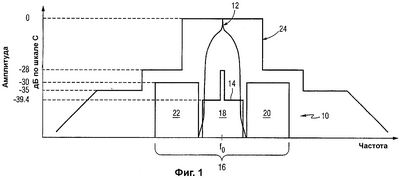 Как показано на фиг. 1, несущие ЦРВ содержатся в канале 16, имеющем ширину полосы 30 кГц. Этот канал разделен на центральную полосу 18 частот и верхнюю 20 и нижнюю 22 полосы частот. Центральная полоса частот имеет ширину около 10 кГц и охватывает частоты, лежащие в пределах ±5 кГц от центральной полосы канала. Верхняя боковая полоса простирается от около +5 кГц от центральной частоты до около +15 кГц от центральной частоты. Нижняя боковая полоса простирается от около -5 кГц от центральной частоты до около -15 кГц от центральной частоты. Маска излучений согласно нормативам FCC представлена ссылочной позицией 24.