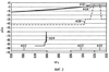 Фиг. 2 обеспечивает пример потенциально самого плохого случая шума из-за помех самому себе для передатчика FDD на полной мощности на самом нижнем канале, наиболее близко расположенном к каналу контроля приемника. Например, граница 402 представляет диапазон нисходящего канала связи DCS от 1805 до 1880 МГц. Границы 403 и 405 представляют диапазон восходящего канала связи UMTS от 1900 до 1980 МГц. Граница 403 представляет принадлежащую TDD часть этого диапазона, и граница 405 представляет потенциально более неприятный диапазон FDD из-за более вероятного возникновения одновременной передачи и приема. В показанном случае передача в FDD UMTS ВКС происходит в полосе пропускания на 3,84 МГц. Спектральная плотность 406 мощности этой передачи показывает передачу в канале, который наиболее близок к нисходящему каналу связи DCS. Существует колено ниже этого канала, содержащее нелинейность n-ного порядка, и ниже него – широкополосный шум на уровне мощности приблизительно 50 дБм. Кривая 404 представляет сигнал нисходящего канала связи DCS (характеристика GSM) в самом близком канале к широкополосной передаче. Сигнал нисходящего канала связи DCS имеет полосу пропускания 150 кГц. Кривая 410 представляет дуплексную (UMTS) селективность в этом диапазоне частот, которая фактически помогает селективности DCS НКС.