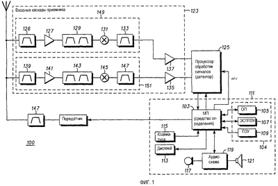 Обращаясь к фиг. 1, на ней показывают структурную схему беспроводного устройства связи в соответствии с настоящим изобретением. Данное устройство предпочтительно является сотовым радиотелефоном, в который внедрено настоящее изобретение. В предпочтительном варианте осуществления микропроцессор 103, такой как микропроцессор 68HC11, также доступный от компании Motorola, Inc., генерирует необходимый протокол связи для работы в совместимой системе сотовой связи. Микропроцессор 103 использует память 104, которая содержит оперативную память (ОП) 105, электрически стираемое программируемое постоянное запоминающее устройство (ЭСППЗУ) 107 и/или постоянное запоминающее устройство (ПЗУ) 109, предпочтительно объединенную в одном модуле 111, для выполнения этапов, необходимых для генерации протокола и выполнения других функций для беспроводного устройства связи, таких как отображение информации на дисплее 113, прием информации от клавиатуры 115 или управление процессором 125 обработки сигналов, что включает в себя управление усилением приемника в соответствии с настоящим изобретением. Процессор 125 обработки сигналов включает в себя демодулятор, синтезатор, процессор обработки цифровых сигналов (DSP) и другие схемы, известные из предшествующего уровня техники, для выполнения преобразования основной полосы частот и соответствующей активной фильтрации, которые необходимы для демодуляции полезного сигнала связи. Микропроцессор 103 также обрабатывает аудиосигналы, преобразованные с помощью аудиосхемы 119, передаваемые от микрофона 117 и на динамик 121.