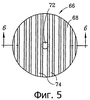 Как видно из фиг.5 и 6, торцевая крышка 66 предпочтительно сформована из полимерной смолы, а в наиболее предпочтительном варианте, из смолы, которая содержит пигмент, выбранный по цвету соответственно калибру иглы 34, показанному на фиг.1-2, чтобы пользователи могли легко различать проводники 10 для введения внутривенных катетеров с иглами разного размера. Торцевая крышка 66 предпочтительно дополнительно содержит, по существу, сплошную кольцевую торцевую стенку 68, соединенную с продольно простирающимся кольцевым бортом 70, который сужается вовнутрь для обеспечения ранее упомянутого контактного фрикционного зацепления с круговой канавкой 62 плунжерной трубки 40. Следует понимать, что существует много способов обеспечивающей зацепление установки торцевой крышки 66 в верхний концевой участок 58 плунжерной трубки 40. Торцевую крышку 66 можно приклеить, защелкнуть пружиной, приварить ультразвуком, выполнить двухструйным литьем или зацепить любым другим аналогичным эффективным средством. Двухструйным литьем называют любой способ формования, который позволяет параллельно формовать разные материалы или разноцветные материалы. Воздушное отверстие 72 расположено предпочтительно по центру торцевой стенки 68 и предпочтительно окружено конструктивными элементами поверхностного рельефа, например, множеством выступающих наружу формованных ребер 74, которые проходят по поверхности 68. В предпочтительном варианте число, шаг и высота ребер 74 достаточны для того, чтобы воздушное отверстие 72 не закрывалось рукой пользователя, даже когда часть руки помещена поверх торцевой крышки 66 при работе с проводником 10 для введения внутривенного катетера. Воздушное отверстие 72 предпочтительно является достаточно большим, чтобы быстро выпускать объем воздуха, вытесняемого из полости 76 для убирания, когда узел 14 иглодержателя убирается в плунжерную трубку 40 после введения катетера.
