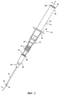 Узел 14 иглодержателя установлен с возможностью убирания в нижнем участке футляра 12 и предпочтительно содержит конусовидный удлиненный трубчатый корпус 32, иглу 34 и пористую пробку 36. Корпус 32 узла 14 иглодержателя выполнен предпочтительно литьем под давлением из, по существу, прозрачной полимерной смолы, например, поликарбонатной, и содержит конусовидную боковую стенку, по существу, постоянной толщины, которая дополнительно ограничивает расширительную камеру 42, пружинонаправляющий участок 44 и участок 46 крепления иглы, каждый из которых имеет последовательно уменьшенный диаметр. Трубчатый корпус 32 узла 14 иглодержателя предпочтительно имеет форму, которая позволяет вставлять узел 14 иглодержателя в допускающее сдвиг зацепление с футляром 12 при сборке, в соответствии с нижеприведенным подробным описанием. Верхний концевой участок трубчатого корпуса 32 выполнен с возможностью разъемного зацепления с нижним концом 56 плунжерного узла 18 в соответствии с описанием, приведенным ниже со ссылкой на фиг.4. Как видно из фиг.2, возвратная пружина 16 заключена в кольцевом пространстве 90 между футляром 12 и пружинонаправляющим участком 44 трубчатого корпуса 32 и закреплена в сжатом состоянии между обращенным вниз заплечиком 92 трубчатого корпуса 32 и обращенным вверх заплечиком 94 футляра 12. Хотя в настоящем варианте осуществления применяется сжатая пружина, которая прилагает возвратное усилие расширением, для убирания иглы можно также применить другое аналогичное эффективное средство, например, пружину растяжения.