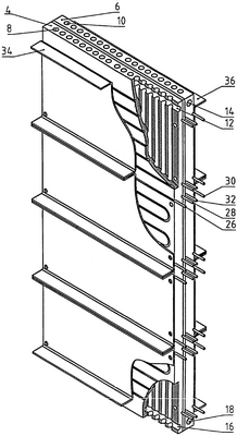 Каждый блок 4 и 6 также оборудован множеством электронагревательных полос 26 и 28, расположенных на внешних сторонах блока 4, и полос 30 и 32, расположенных на внешних сторонах блока 6 или в желобках (не показаны) на поверхности. Электронагревательные полосы 26, 28, 30 и 32 расположены в основном перпендикулярно реакционным каналам 8, 10. Блоки собраны внутри обычного корпуса 34, оборудованного кронштейнами 36, для поддержки изолирующего материала (не показан) на внешней поверхности корпуса 34.