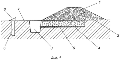 Под основанием 2 напорного сооружения в виде плотины 1 сооружают дренажное устройство, включающее дренаж (не показан) и емкость для сбора фильтрационной воды 3. Для выполнения дренажа прорывают перпендикулярно оси плотины 1 на глубину около 2 м траншею 4 шириной около 1 м. На дно траншеи 4 укладывают перфорированную дренажную трубу 5, например асбестоцементную, торец которой выводят в отрытую емкость для сбора фильтрационной воды 3, которая фильтруется через тело (не показано) и основание 2 плотины 1. Траншею 4 заполняют гравийно-галечным грунтом и покрывают геотекстилем (не показаны). Защищают геотекстиль гравийным грунтом от повреждений при дальнейших технологических операциях. Возводят плотину 1 из местных материалов. Уплотнение грунтов, отсыпанных в тело плотины, производят используемыми при строительстве механизмами.