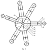 Радиальные ребра снабжены отверстиями на концах. Они соединены трубчатыми стержнями 6 с вваренными проушинами 7, которые зафиксированы заглушками 8. Соединение проушин 7 и ребер 4 – фрикционное на высокопрочных болтах с использованием накладок 9 и 10, выполнено в виде тавра. Узел соединения дополнен вставками 11, расположенными между торцом стержня 6 и гнутой вальцованной полосой 5. Вставки 11 выполнены из двух половинок соответствующей трубы.