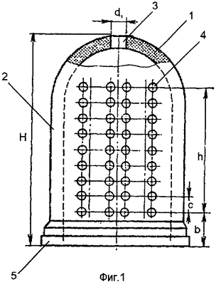 1. Глушитель шума, содержащий впускной патрубок и жестко связанный с ним корпус из пористого материала, отличающийся тем, что корпус выполнен из пористого материала составным в виде цилиндрической и сферической обечаек, образующих одно целое, причем в цилиндрической обечайке дополнительно выполнены отверстия в кольцевых сечениях на высоте b от основания впускного патрубка до сечения, расположенного на высоте h с межцентровым послойным расстоянием с, причем отверстия выполнены под углом 60° друг к другу, образуя углы с вершинами, направленными от оси обечаек, а на вершине сферической обечайки выполнено отверстие, причем отношение высоты всего корпуса Н к диаметру D цилиндрической обечайки находится в диапазоне оптимальных величин H/D=1,5…3,0.